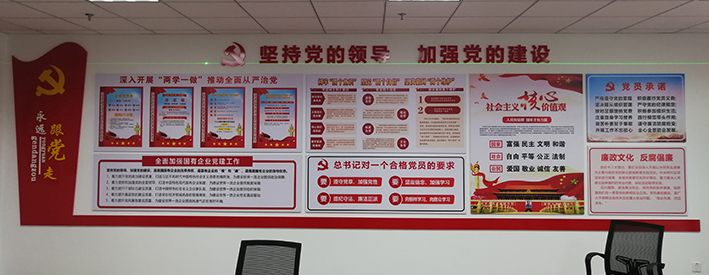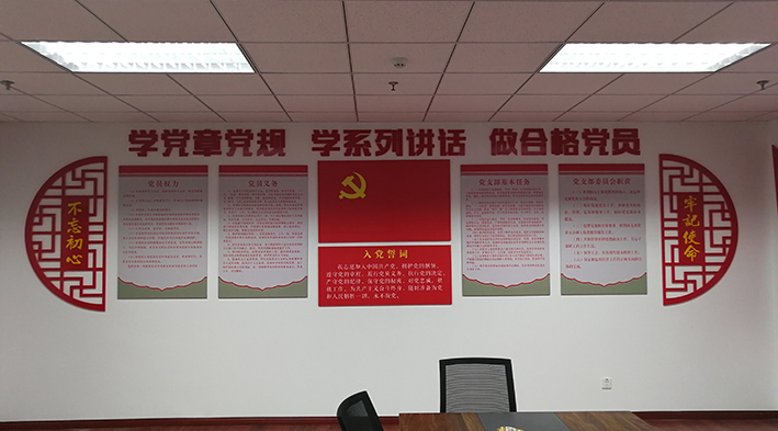 活動室要要懸掛黨旗、入黨誓詞。黨旗可以使實物,也可以上墻做成噴繪。一般設計是黨旗居于整個活動室的顯要位置,入黨誓詞居于黨旗下方。要有有關黨員的各種制度。支部組成、支部委員分工、各種會議制度上墻,對稱張貼,會讓整個活動室顯得有序合理。